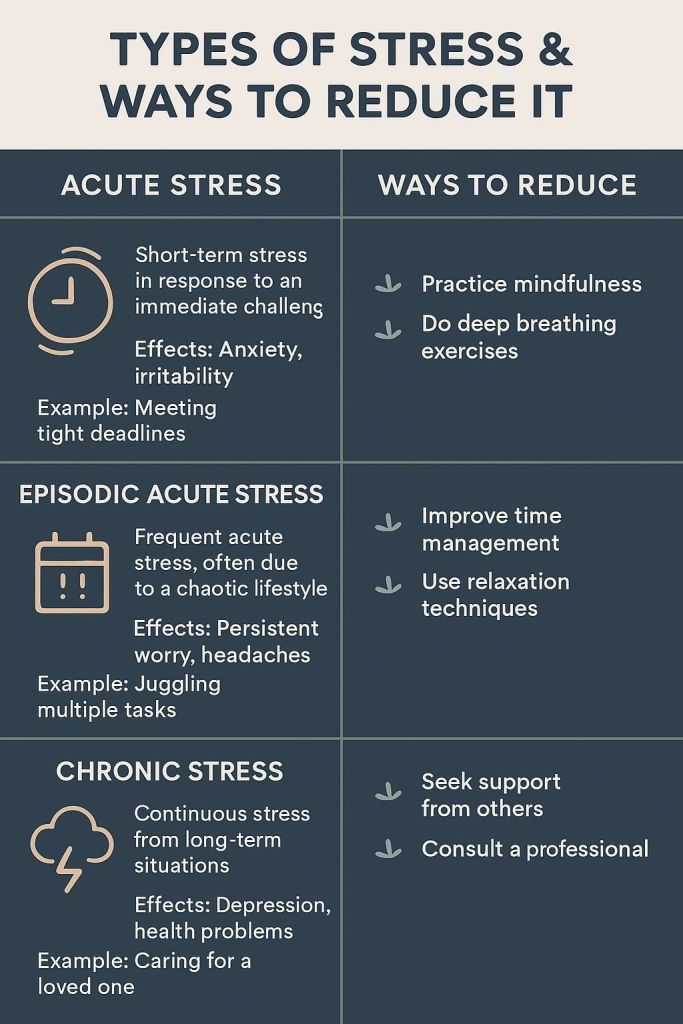 Stress is an inevitable part of life. While it’s a natural response to challenges or threats, chronic stress can take a toll on our physical, mental, and emotional well-being. Understanding the types of stress and learning how to manage them effectively is crucial for leading a balanced life.
