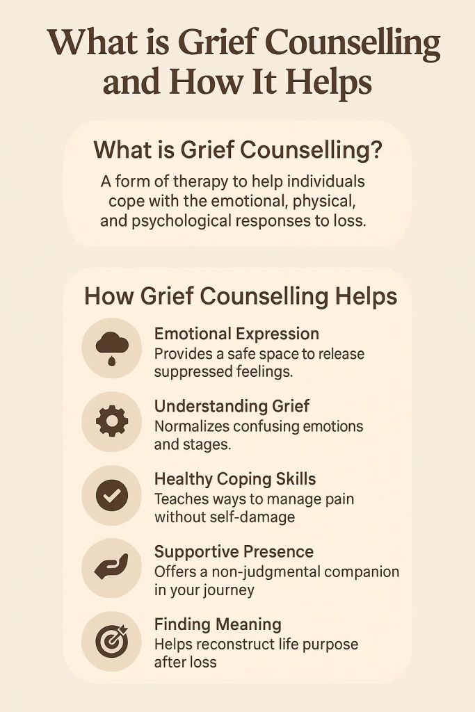 Grief counselling is a form of therapy designed to help individuals cope with the emotional, physical, and psychological reactions that follow a significant loss. It provides a safe and understanding space to express sorrow, anger, confusion, guilt, or any complex emotion tied to the loss.