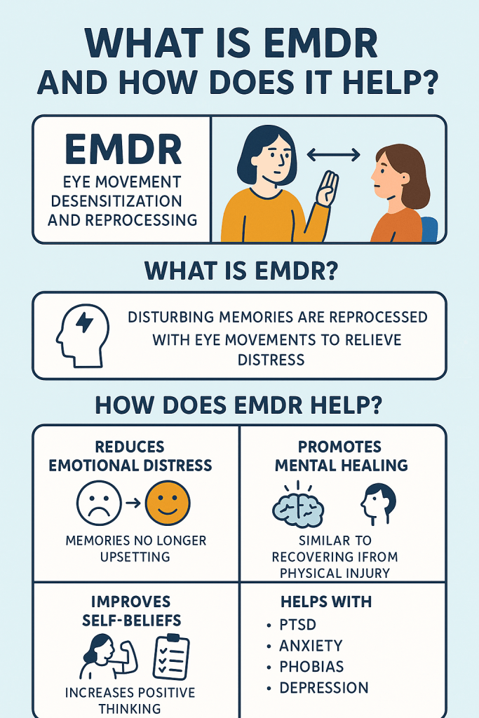 Meera was in a car accident. Even after months, she couldn’t drive without fear and kept dreaming about the crash. After EMDR therapy, her fear reduced, her nightmares stopped, and she could drive comfortably again. Her mind had “reprocessed” the fear to make it manageable.