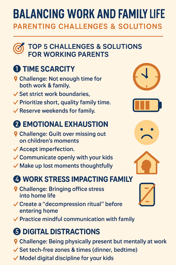 Balancing two demanding worlds drains emotional energy. Parents are expected to be professional, patient, and productive at work, and nurturing, fun, and attentive at home. This dual expectation often leads to burnout.